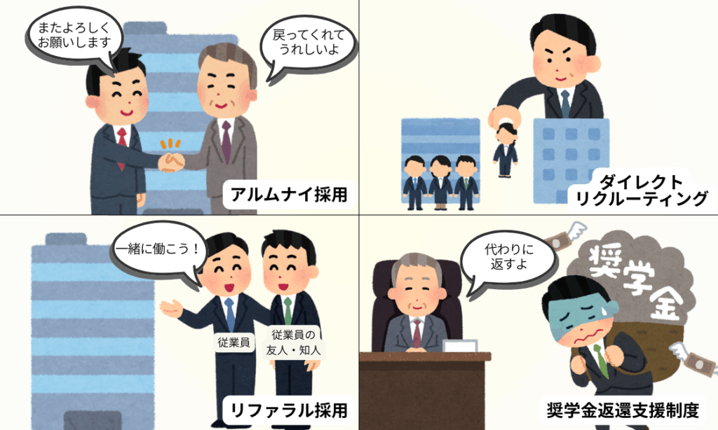 近年注目されているのは、過去の社員を再び迎え入れる「アルムナイ採用」、社員紹介による「リファラル採用」、企業から積極的にアプローチする「ダイレクトリクルーティング」、そして福利厚生の一環として話題の「奨学金返還支援制度」の導入です。